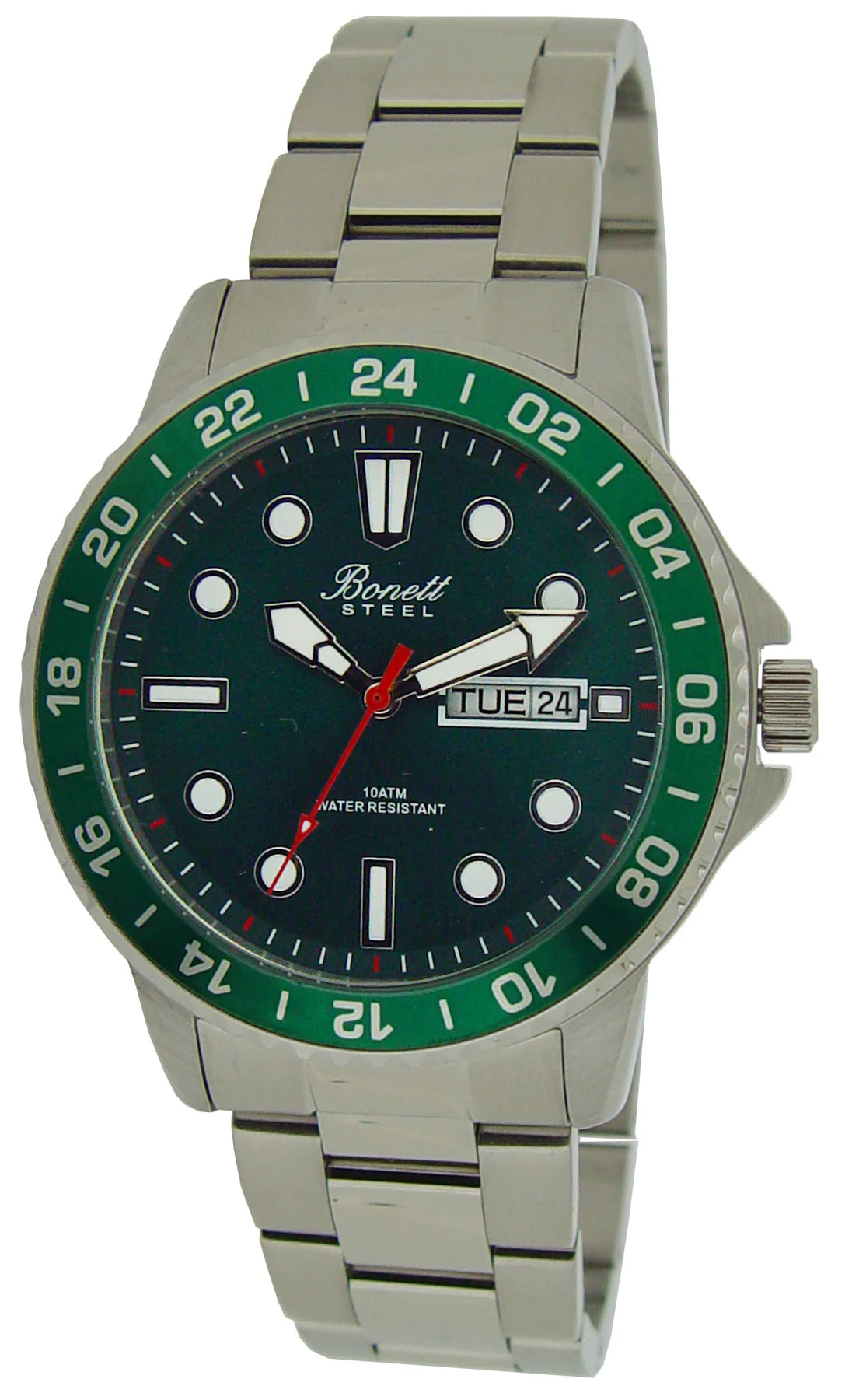 Ur í stál við grønari skivu, við dag og dato vísara.