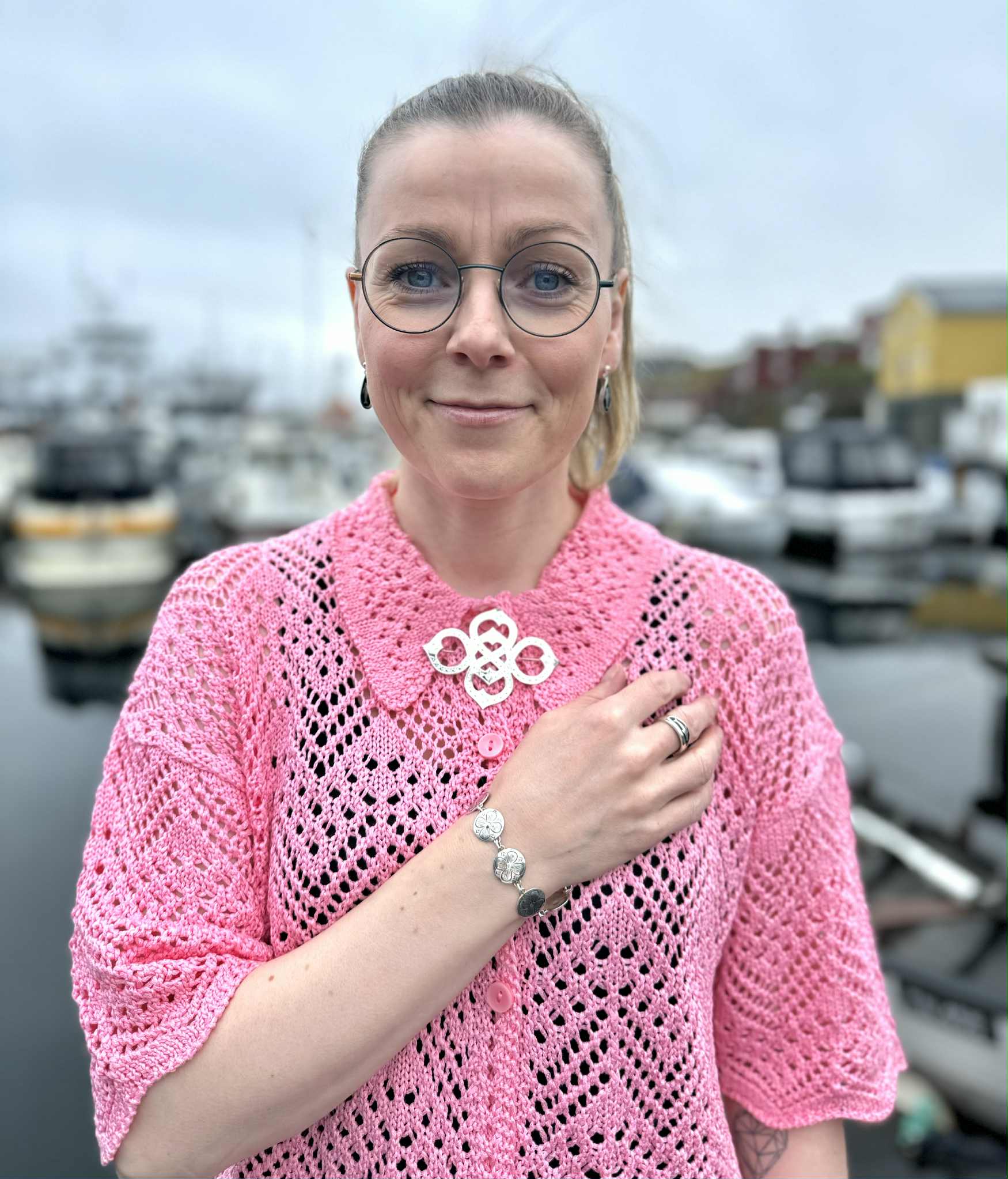 Knappaarmband við fløtum vestaknappi.